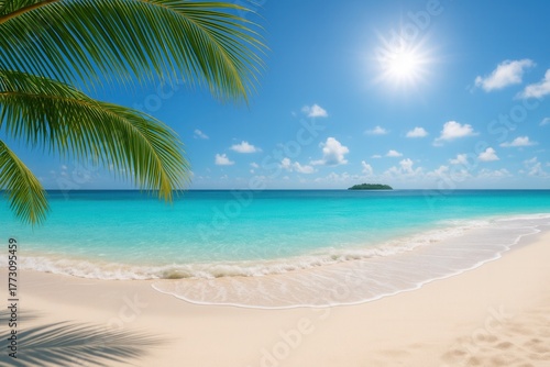 Sunny tropical beach with palm fronds framing turquoise lagoon and distant islet