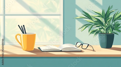 Sunny workspace with open book, pencils, glasses, and plant on windowsill.