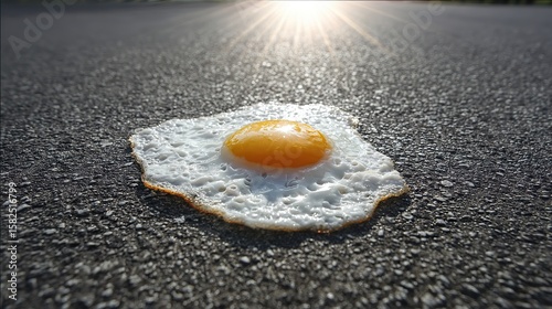 Sunny-side up egg frying on hot asphalt under intense sunlight, symbolizing extreme summer heat and global warming, high-detail realism with rising heat distortion and harsh midday shadows