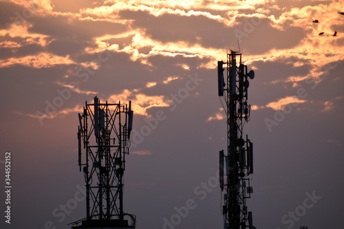Sunrise behind mobile tower in the city