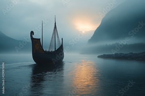 Sunrise casting golden hues over a Viking longship sailing through misty waters
