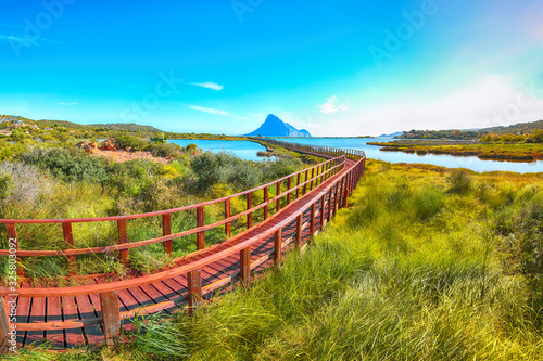 Sunrise from a pedestrian walkway to Porto Taverna beach.