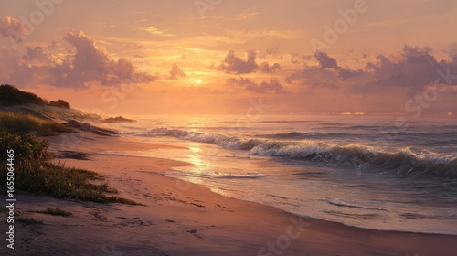 Sunrise over a calm ocean, light reflecting on the sand and the gentle breaking waves
