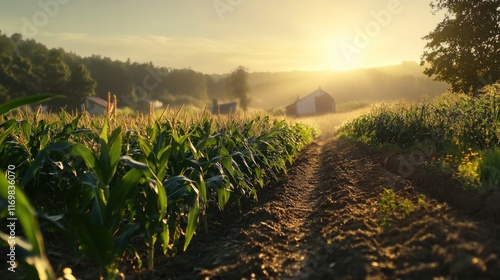 Sunrise over a cornfield with a farmhouse in the background.