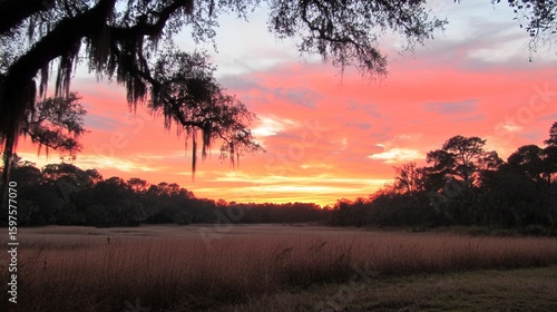 Sunrise over a field, silhouetted trees