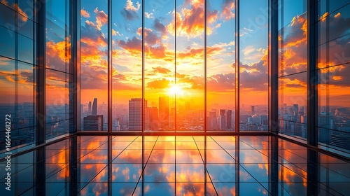 Sunrise over a modern city skyline reflected in glass skyscrapers