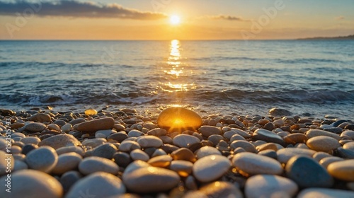 Sunrise Over a Pebble Beach Calm Ocean Waves and Golden Light