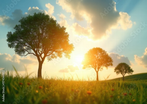 Sunrise over a serene landscape with trees and golden grass in the morning light