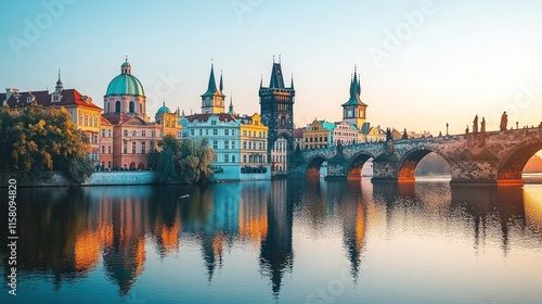 Sunrise over Charles Bridge, Prague, colorful buildings reflected in Vltava River.