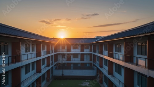 Sunrise Over Courtyard Building Tranquil Urban Scene Architectural Harmony