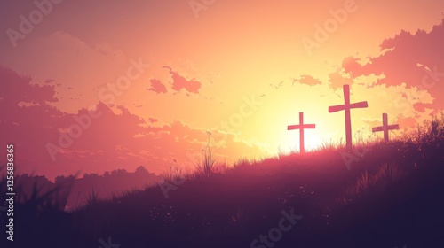 Sunrise over crosses on a hill - A peaceful and spiritual landscape
