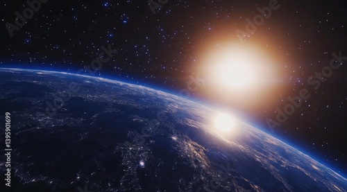 Sunrise over Earth from space, showing city lights and starry sky.