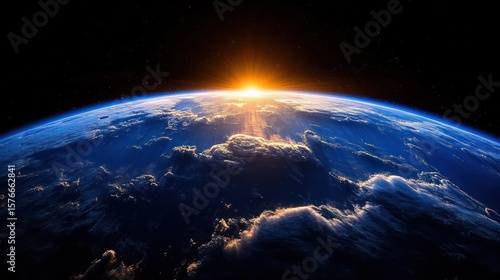 Sunrise over Earth viewed from space with dark starry background and illuminated atmospheric clouds