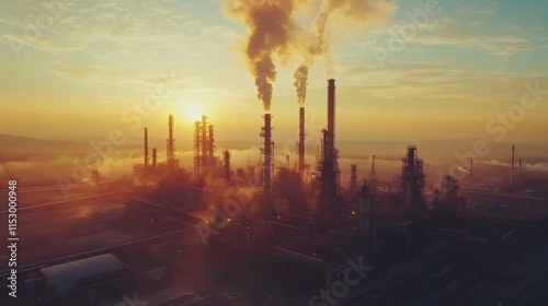 Sunrise over industrial complex with smoke stacks emitting pollution.