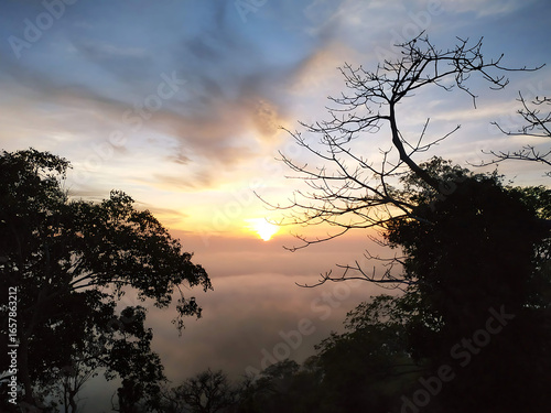 Sunrise Over Misty Forest with Silhouette Trees