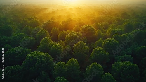 Sunrise over misty pine forest, aerial view