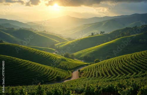 Sunrise over rolling hills of green vineyard. Scenic road winds through rural valley landscape. Rows of grapevines create patterns on farmland. Beautiful summer wine country with mountains, golden