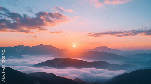 Sunrise over the mountains, with mist rising from below and the sun at the center