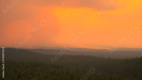 sunrise over the mountains,A vast forest burning under an intense orange sky, thick smoke rising, firefighters in the distance battling the wildfire.