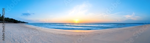 Sunrise over tranquil ocean beach. Panoramic view of serene coastal landscape.