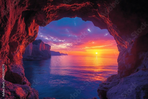 Sunrise through a rocky cave overlooking the sea