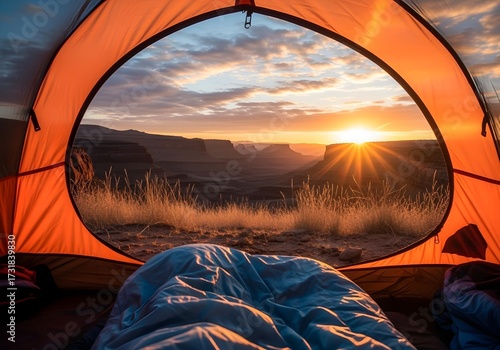 Sunrise view from inside camping tent overlooking desert canyon landscape showing peaceful outdoor travel adventure experience