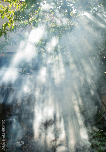 Sun's rays penetrate through the leaves and smoke