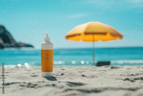 Sunscreen bottle on sandy beach with umbrella and blue sky background. Summer vacation concept