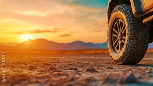 Sunset Adventure: Off-Road Vehicle Tire on Desert Landscape