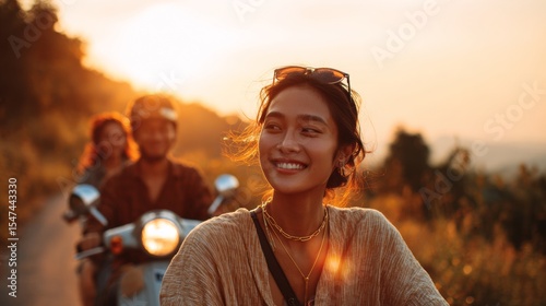Sunset adventure with an Asian woman riding a motorbike, joyful friends following closely on a scooter along a mountain path.