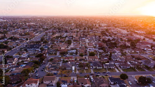 Sunset aerial view of a neighborhood in Downey, California, USA.