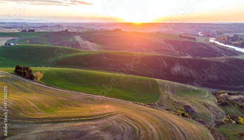 Sunset aerial view over Palouse Hills showcasing golden farmland in vibrant autumn season with rolling landscape and warm evening light