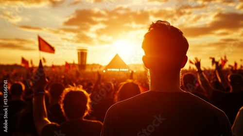 Sunset at lively music festival crowd, summer outdoor celebration, vibrant concert atmosphere, unity, enjoyment