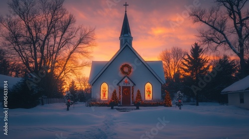 Sunset behind a snow-covered church with a Christmas wreath on the door and glowing candles in the windows.