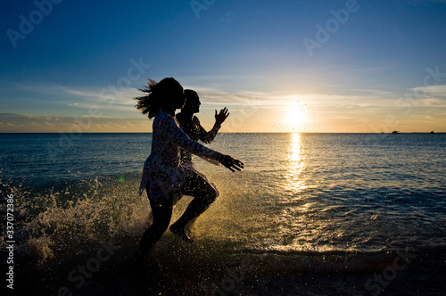Sunset couple running through the waves
