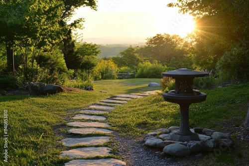 Sunset garden path, stone lantern, tranquil landscape.