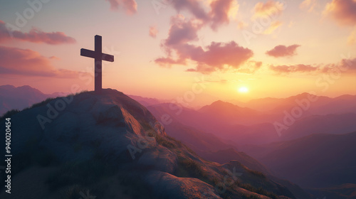 sunset glow across sky, cross atop mountain seemed to illuminate with divine light, a powerful symbol of Jesus Christ and the profound connection between God and religion amidst drifting clouds.