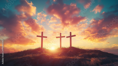 sunset glow across sky, cross atop mountain seemed to illuminate with divine light, a powerful symbol of Jesus Christ and the profound connection between God and religion amidst drifting clouds.