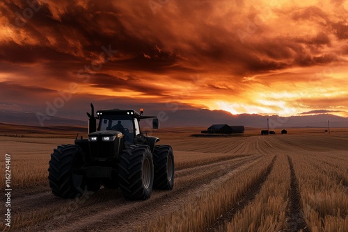 Sunset Harvest Tractor Scene - Tractor, sunset, farm, field, harvest. Symbolizes hard work, nature, abundance, rural life, and tranquility.