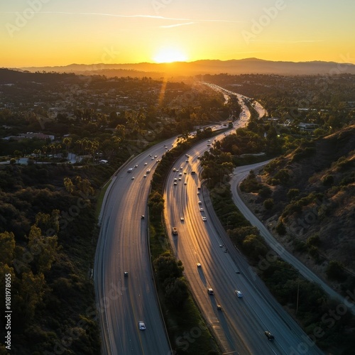 Sunset highway cars aerial view hills.