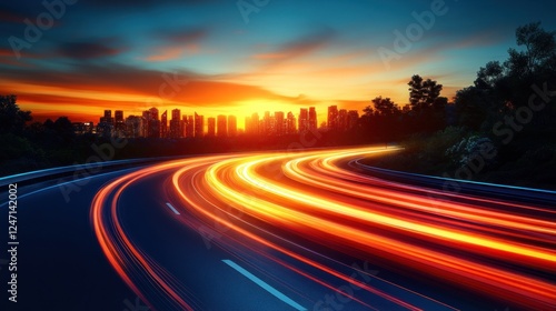 Sunset highway speed, city skyline