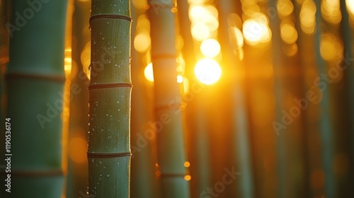 Sunset illuminating bamboo forest.
