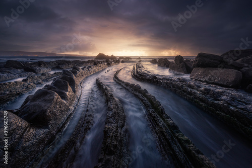 Sunset in the Cantabrian Sea, in the Barrika Beach with their famous rock formations, the flysch