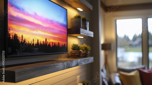 Sunset landscape displayed on TV above rustic shelves with plants.