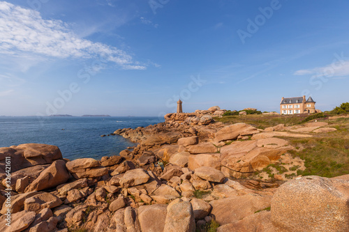 Sunset landscapes of the famous Cote de Granit Rose (Rose coast) near Lannion, Coastline in Phare de Men Ruz, Brittany, France