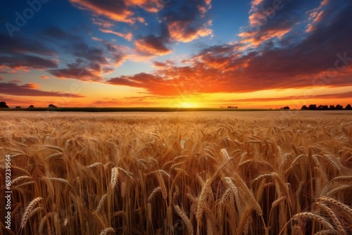 Sunset on the field with young wheat in the summer with a cloudy sky background.