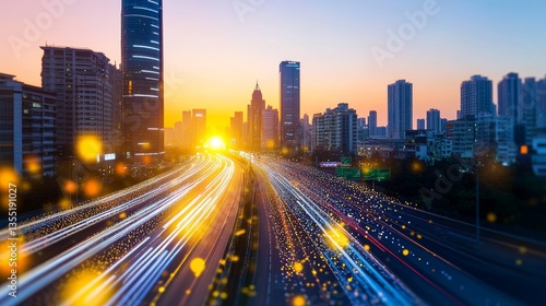 Sunset over a bustling city skyline with light trails from busy traffic on a highway
