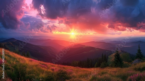 Sunset over a Mountain Range with a Forest and Meadow in the Foreground