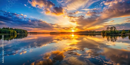 Sunset over a serene lake with the beautiful sky reflected in the clear water , sunset, lake, reflection, sun, sky, water, nature