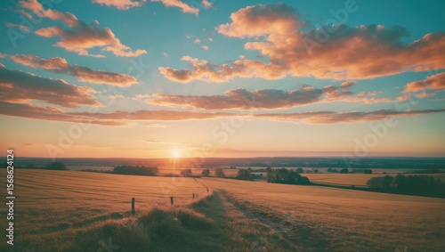 Sunset over a vast rural landscape with fields and scattered clouds, capturing a peaceful and expansive natural scene.